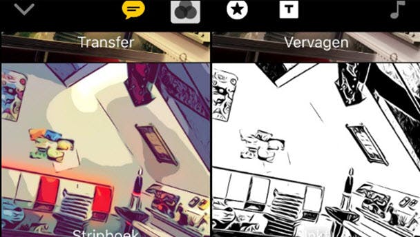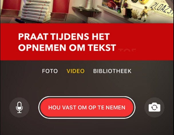 Naast het schieten van een gewone foto of video kun je ook een foto of video schieten met Live Titles. Daarvoor druk je op het pictogram met het tekstballonnetje bovenin. Selecteer een indeling die je mooi vindt, en druk vervolgens op de rode balk om je video te schieten. Wanneer je nu praat tijdens het opnemen, dan zullen de woorden die je uitspreekt in beeld verschijnen, gesynchroniseerd met het moment dat je ze uitspreekt. Op die manier voeg je wat extra’s toe aan je video. Dit werkt overigens ook met foto’s, maar dat voelt toch wat minder speciaal.