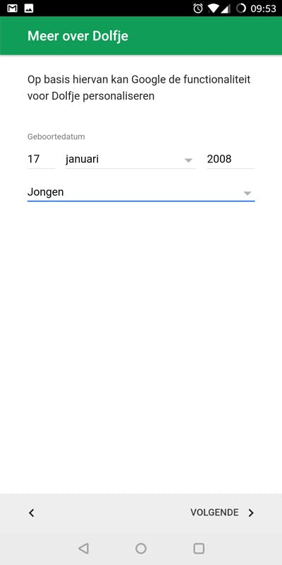 Installeer eerst de Family Link-app op je eigen telefoon. Start de app, tik onderin op Starten en volg de aanwijzingen op het scherm. Eerst vraagt Family Link je een gezinsgroep aan te maken op basis van je eigen Google-account. Tik op Ja, ik ga akkoord, en een paar keer op Volgende om een aparte Google-account voor je kind te maken. Eerst vul je zijn of haar naam in, gevolgd door geboortedatum en geslacht. Deze datum is belangrijk omdat een account voor kinderen enkel geldt voor personen jonger dan 13 jaar.
