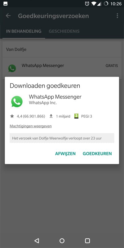 Wanneer jouw kind een app wil installeren vanuit de Play Store, dan kan dat niet zomaar. Hij of zij krijgt dan de vraag om toestemming te vragen voorgeschoteld . Zodra zij tikken op Toestemming vragen, krijg je een melding binnen op je telefoon. Tik daarop om uit te komen bij je Goedkeuringsverzoeken, en druk op Goedkeuren. Daarna start automatisch de installatie van de app op het andere toestel.