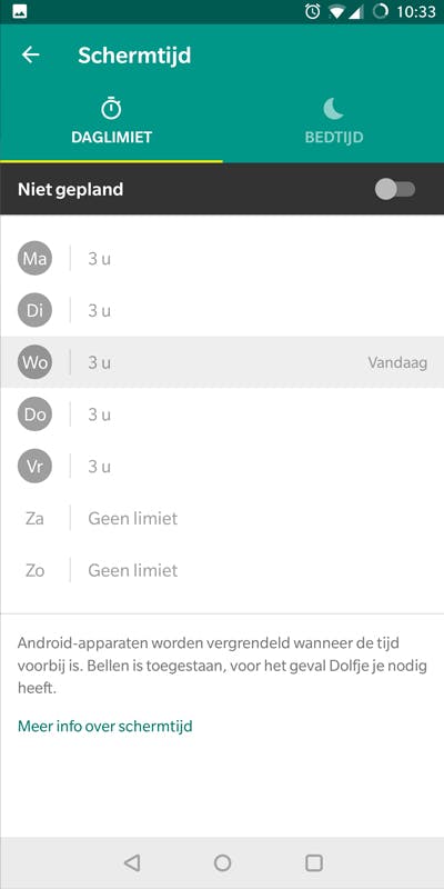 In bovenstaande afbeelding zie je ook de optie Schermtijd, die je ook in het hoofdmenu van Family Link kunt vinden. Je kunt bij Daglimiet per dag instellen hoeveel uur je kind zijn of haar smartphone kan gebruiken. Daarna wordt het toestel vergrendeld. Dat geldt bovenin ook voor de optie Bedtijd. Hier geef je aan op welk tijdstip de telefoon 's avonds niet meer bruikbaar is. Alleen de optie om te bellen blijft over, voor noodgevallen.