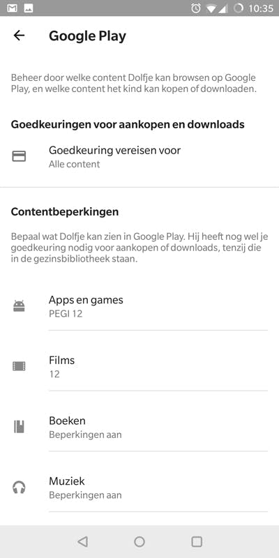Wil je je kind iets meer vrijheid geven in de apps die hij of zij kan installeren, kies dan de optie Goedkeuring vereisen voor. Stel hier bijvoorbeeld in dat goedkeuring alleen gevraagd dient te worden wanneer het om een betaalde app gaat, of wanneer apps in-app-aankopen faciliteren. Gratis apps kunnen dan zonder extra toestemming worden geïnstalleerd.