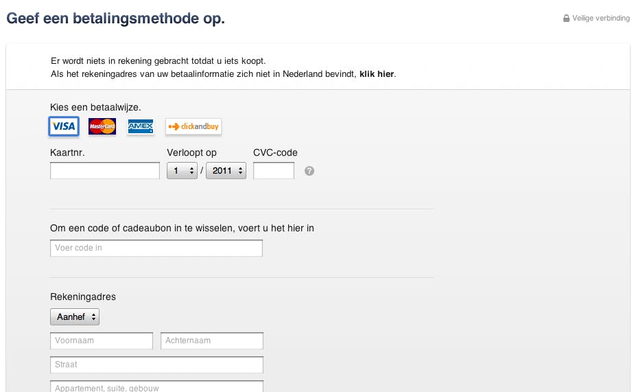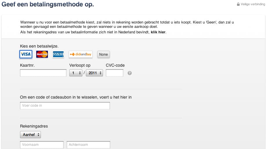 Zodra je je gebruikersnaam en wachtwoord hebt ingevuld kom je op een pagina waar je je betaalgegevens moet opgeven. Hier kun je naast de verschillende creditcardmaatschappijen ook kiezen voor de optie 'Geen'. Door hiervoor te kiezen hoef je niet direct tegoed op je iTunes Account te zetten. Let op! Deze optie krijg je alleen te zien als je eerst een gratis app hebt geselecteerd.