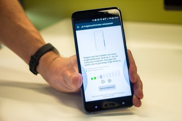 HTC is in de jaren nooit bang geweest om te innoveren. Soms lukt dat, met het metalen unibody ontwerp bijvoorbeeld. Soms kwam het ook niet uit de verf, zoals met de dubbele camera van de HTC One (M8). Met de U11 durft de fabrikant ook weer. Zo zijn de zijkanten van het toestel onderaan drukgevoelig. Je kunt het toestel dus bedienen door erin te knijpen. Je kunt een actie koppelen aan een korte kneep en een lange. Bijvoorbeeld om een app te starten, een foto te maken, of de spraakassistent te starten. Is het een gimmick? Een beetje. Persoonlijk had ik ingesteld dat een korte kneep de camera start (het werkt ook als het toestel nog niet ontgrendeld is namelijk) en de lange kneep om de zaklamp te activeren. Handig, dat wel. Maar in praktijk gebruikte ik het weinig en voelt het niet echt natuurlijk om op deze manier een smartphone te bedienen. Gelukkig geeft HTC je de complete vrijheid om deze functionaliteit helemaal zelf te configureren, door de actie te bepalen, de drukgevoeligheid in te stellen of het helemaal uit te zetten. Overigens werkt het ook als je een hoesje om het toestel hebt.