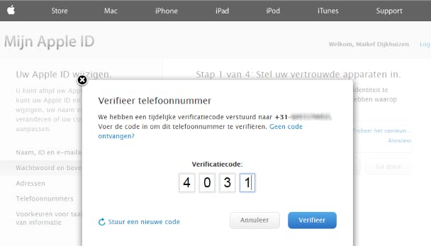 Na drie dagen wachten kun je twee-staps-verificatie activeren. Ga naar het beveiligingsgedeelte van Mijn Apple ID en klik op Aan de slag. Nadat je tweemaal op Ga door hebt geklikt, kies je wederom voor Aan de slag. Via Voeg een telefoonnummer toe vul je het juiste mobiele nummer in. Klik op Volgende. Je ontvangt nu een verificatiecode op je toestel. Neem de code over en bevestig met Verifieer. Naast sms kun je er ook voor kiezen om de codes te ontvangen via meldingen van Zoek mijn iPhone. Klik in dat geval achter de naam van je iPhone op Verifieer en neem de code over. De enige voorwaarde is dat Zoek mijn iPhone is geactiveerd (Ga hiervoor op je iPhone naar Instellingen / iCloud / Zoek mijn iPhone).