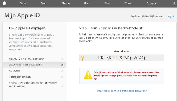 Het is riskant om een herstelcode te verliezen. Zodra dat is gebeurd, vraag je meteen een nieuwe herstelcode aan. Surf naar de website en klik op Beheer uw Apple ID. Typ daarna je inloggegevens en kies voor Log in. Neem de verificatiecode over van je mobiele toestel. Je navigeert vervolgens naar Wachtwoord en beveiliging. Klik op Vervang verloren herstelcode om een verse code aan te vragen. Via Volgende en Druk code af print je de herstelcode uit. Vul ter bevestiging alle karakters in en sluit af met Activeer.
