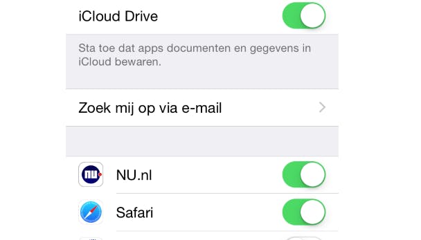 Via iCloud Drive zijn apps in staat om data met de online server van Apple te synchroniseren. Het voordeel hiervan is dat bijvoorbeeld documenten, pdf-bestanden, spreadsheets en afbeeldingen ook op je pc en Mac beschikbaar zijn. Gelukkig bepaal je helemaal zelf welke data je op iCloud bewaart. Het staat je namelijk vrij om privébestanden voor de zekerheid uitsluitend lokaal op te slaan. Navigeer op je iPhone naar Instellingen / iCloud / iCloud Drive. Je ziet een overzicht van apps die documenten en gegevens in iCloud bewaren. Via de schuifknop geef je aan welke apps hiervoor toestemming hebben. Je kunt desgewenst ook besluiten om iCloud Drive helemaal uit te zetten.