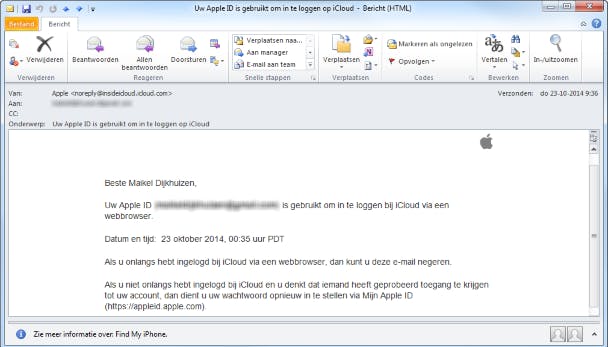 Indien er wordt ingelogd op je iCloud-account, stuurt Apple voor de zekerheid een waarschuwingsmail.