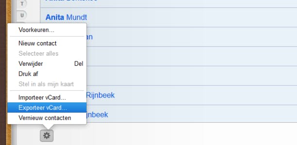 Klik vervolgens op Contacten en druk op Ctrl+A om alle contactpersonen te selecteren. Eenmaal geselecteerd, klik je linksonder op het tandwiel en vervolgens op Exporteer vCard. Je exporteert dan een adressenbestand met daarin alle contactpersonen uit iCloud. Sla het .vcf-bestand ergens op.