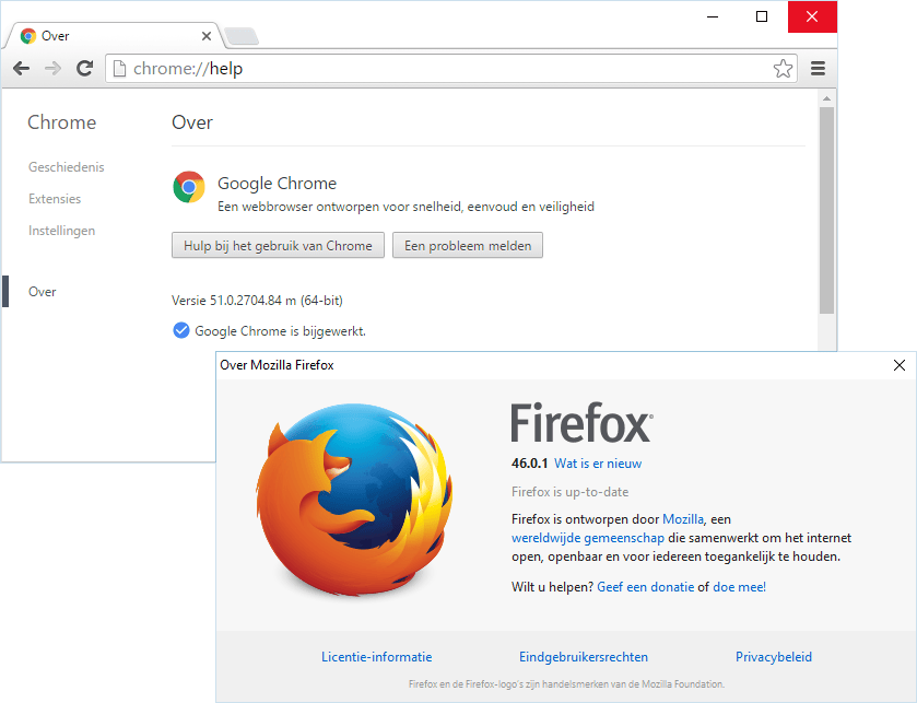 Welke browser je gebruikt is helemaal bij jou. Wel willen we je op het hart drukken om ervoor te zorgen dat je met de meest recente versie werkt. Hiermee voorkom je dat je slachtoffer wordt van oude lekken. Alle browsers hebben een automatische update-functie, maar het is verstandig om dit regelmatig handmatig te controleren. In Firefox druk je op de Alt-toets. Ga naar Help / Over Firefox om te zien of je browser bij de tijd is. In Chrome klik je op de drie streepjes en kies je Help / Over Chrome. Internet Explorer en Edge worden in Windows 10 bijgewerkt via Windows Update. Als je een oudere Windows-versie hebt, kun je de meest recente Internet Explorer-versie binnenhalen.