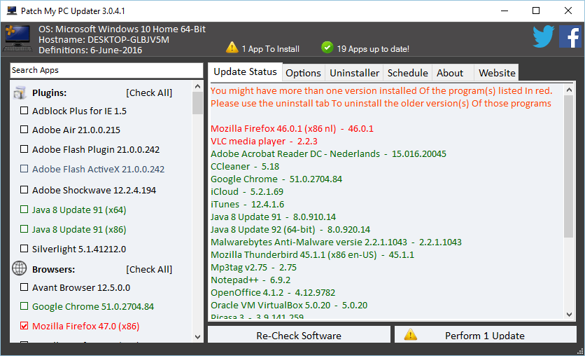 Omdat veel browsers ook uitbreidingen van derde partijen gebruiken, bijvoorbeeld java en onderdelen van Adobe, is het noodzakelijk om deze onderdelen regelmatig te updaten. Dit kun je handmatig doen of via de ingebouwde update-functie van het betreffende programma. Het is slimmer om een oplossing te gebruiken die al je software bijwerkt naar de meest recente versie, bijvoorbeeld Patch My PC of Kaspersky Software Updater.