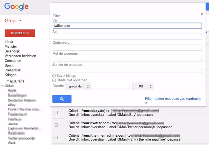 Ga naar je Gmail-inbox in je browser en klik op het tandwiel rechtsboven. Kies voor Instellingen en navigeer naar het tabblad Filters en geblokkeerde adressen. Hier zie je een overzicht van al je aangemaakte filters. Heb je nog geen filters toegevoegd, klik dan onderin op Nieuw filter maken. Wil je alle mail van een bepaalde site naar een aparte map aan de linkerkant toewijzen, geef dan bijvoorbeeld onder Van een site op als twitter.com. Vervolgens klik je op Filter maken met deze zoekopdracht. Op de volgende pagina kun je de optie Inbox overslaan selecteren als je wilt dat berichten van Twitter niet meer in je reguliere inbox verschijnen. Lees ook: 17 tips om je e-mail te beheren met Inbox by Gmail.