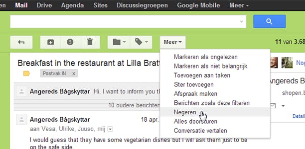 Wanneer je de webinterface van Gmail gebruikt, open je de mailwisseling waarvan je niet langer op de hoogte wilt blijven. Klik vervolgens in de bovenbalk op Meer en selecteer Negeren uit het keuzemenu. De e-mail zal verdwijnen uit je Postvak IN, en antwoorden binnen de mailwisseling zal je niet meer direct onder ogen krijgen. Het bericht zal alleen weer in je Postvak IN komen te staan wanneer iemand in de thread je direct e-mailt.