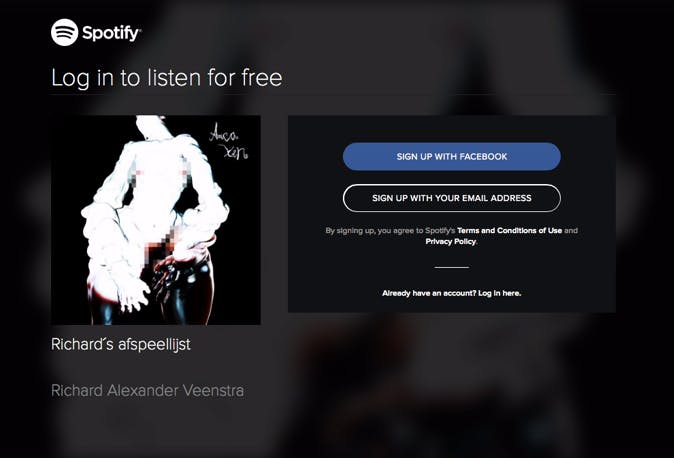 Als je een afspeellijst ontvangt, krijg je deze pagina te zien zodra je de koppeling opent. Door in te loggen wordt de afspeellijst aan je Spotify-account toegevoegd.