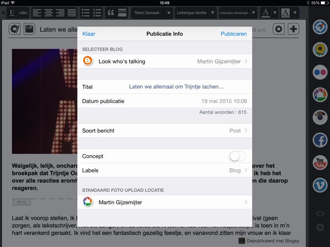 Is je blog helemaal naar wens? Dan wordt het tijd om deze te publiceren. Druk linksboven op het pictogram met het tandwiel en het potlood, waarna het venster Publicatie-info zal verschijnen. Bij Selecteer Blog kun je vervolgens de blog kiezen waarop je wilt publiceren (als je er meer dan één hebt) en ook hier kun je eventueel nog de publicatiedatum aanpassen. Wil je de blog wel uploaden maar nog niet publiceren, schakel dan de optie Concept in. Eventueel kun je nog labels toevoegen (handig om gerelateerde blogs weer te geven). Ben je tevreden? Druk dan rechtsboven op Publiceren om je blog te publiceren.