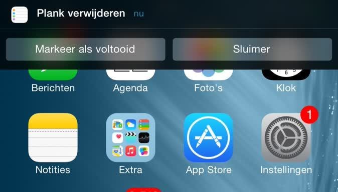 Een notificatie van de Mail-app toont bijvoorbeeld de opties 'Markeer als gelezen' en 'Verwijder'. Ook de Herinneringen-app heeft meerdere opties: 'Markeer als voltooid' en 'Sluimer'. Heb je de Herinnering-app zo ingesteld dat deze als strook boven aan het scherm verschijnt, dan kun je hem naar beneden 'trekken' voor dezelfde opties als in het Berichtencentrum.