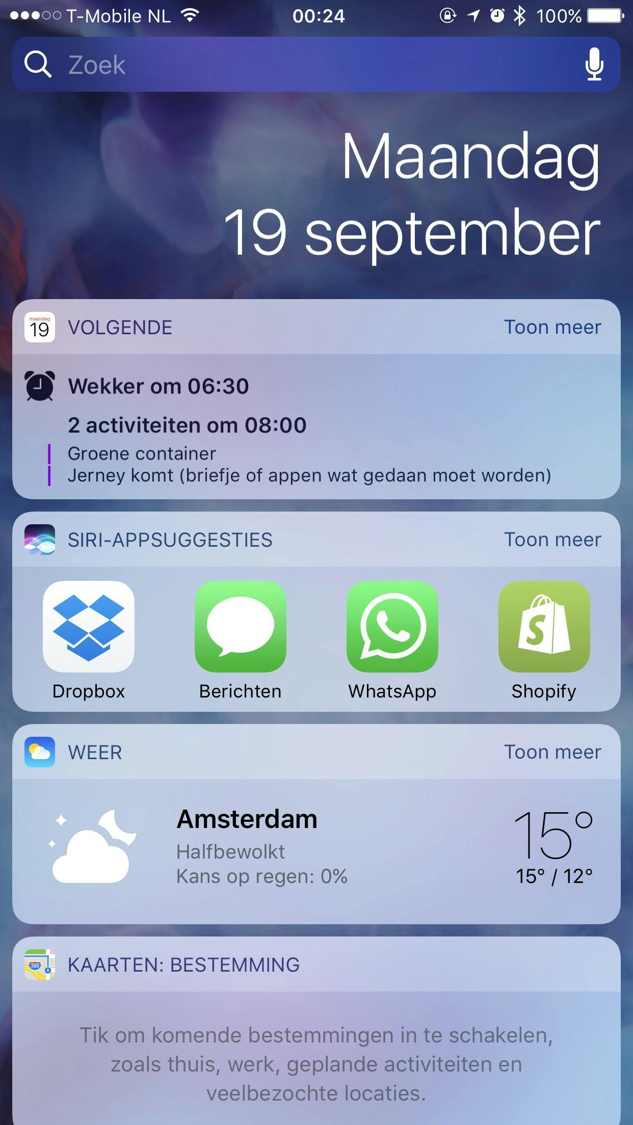 Heel erg is dat niet, want Vandaag is wel een verdraaid fijne nieuwe toevoeging. Het is een scherm dat vol staat met widgets, die je naar eigen inzicht kunt verwijderen en toevoegen. Zo heb je dus in één oogopslag bijvoorbeeld het weer, het nieuws, je agenda, enzovoort.