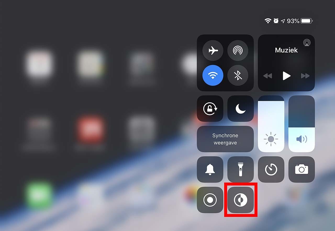 Eindelijk heeft ook iOS 13 een donkere modus. Liefhebbers ervan zeuren er al jaren over. Inmiddels heeft ook Apple het licht gezien (of juist niet...) en deze optie geïntroduceerd in iOS 13 (en iPadOS). Het moet zorgen voor een donkere achtergrond in compatibele(!) apps die het lezen in de donkere uren voor sommigen prettiger maakt. Idealiter wordt je bijvoorbeeld op een zwart scherm met daarop witte tekst getrakteerd. Niet iedereen is daarvan gecharmeerd, vandaar dat je de donkere modus naar smaak in- en uit kunt schakelen. Het is jammer dat het niet per app kan, want Foto's - zeker in de nieuwe iOS 13 variant) zou bijvoorbeeld best permanent in donkere modus kunnen werken, terwijl het voor iets als Safari beter is om juist altijd in de lichte modus te werken. Om de donkere modus systeembreed aan te zetten is het zaak om eerst een knop daarvoor aan het Bedieningspaneel van het nieuwe iOS toe te voegen. Dat doe je door de app Instellingen te starten en daarin, in de kolom links op Bedieningspaneel te tikken. Tik vervolgens rechts op Pas regelaars aan en tik in het lijstje onder MEER REGELAARS op het groene plusje voor Donkere modus. Veeg je nu op bijvoorbeeld je iPad of meer recente iPhone van de rechterbovenhoek van je scherm naar beneden, dan verschijnt het Bedieningspaneel, met daarin de nieuwe knop Donkere modus (zie de knop in het rode vierkantje in de afbeelding hieronder). Tik erop en je apparaat schakelt naar donkere modus, nog een keer tikken schakelt weer terug naar licht. Overigens: bij wat oudere iPhones moet je van de onderrand van het scherm naar boven slepen om het Bedieningspaneel te zien. Uiteraard geldt dat ook daar de donkere modus alleen beschikbaar is na upgraden naar iOS 13.