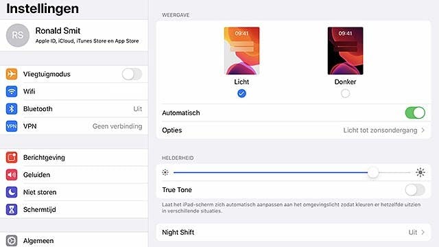 Goed, we kunnen nu dus handmatig schakelen tussen donkere en lichte modus. Maar het kan ook automatisch, zodat jij in de nachtelijke uren automatisch over een aan het duister aangepast i-apparaat beschikt. Tik - nog altijd in de app Instellingen - op Beeldscherm en helderheid in de kolom links. Zet de schakelaar bij WEERGAVE op Automatisch en kies onder Opties de gewenste omschakeltijden. Combineer de automatische donkere modus eventueel met Night Shift, dat zorgt voor iets warmere tinten. Dat oogt allemaal net wat prettiger in het donker! Dit setje samen zorgt dan ook voor een oogvriendelijker geheel van iOS 13 in het dagelijks (nachtelijks) gebruik. Bedenk echter wel dat (nog?) lang niet alle apps donkere modus ondersteunen. Maar dat merk je natuurlijk vanzelf, want de niet 'compatibele' apps blijven ook in de donkere modus heerlijk helder.