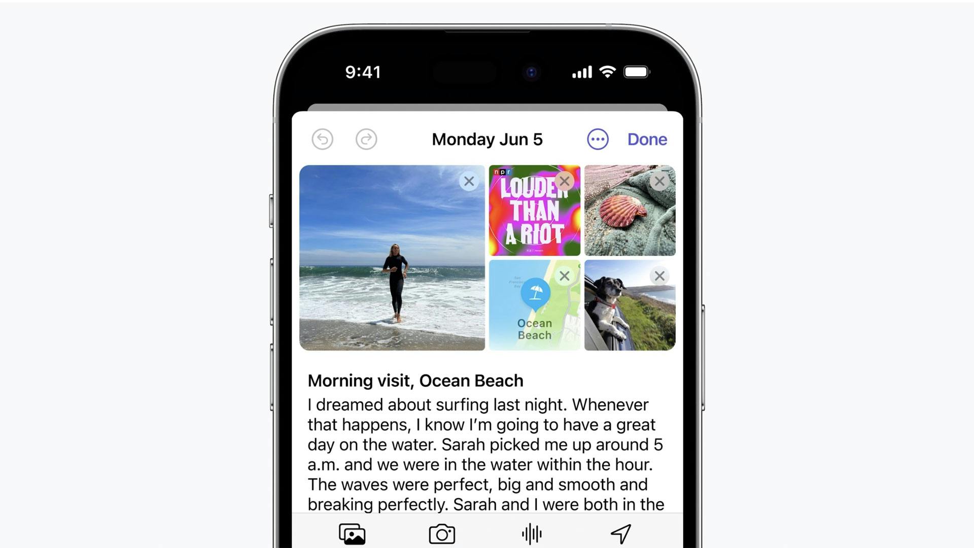 Een nieuwe app die Apple presenteert is Journal (Dagboek). Daarmee kun je een persoonlijk dagboek bijhouden. De app maakt gebruik van on-device machine learning om suggesties te doen over onderwerpen. Je kunt gebruikmaken van foto’s, video’s, muziek, workouts en nog veel meer. Niet alleen vormen ze misschien de juiste inspiratie, ook kun je ze moeiteloos in je verhaal gebruiken. De app zal verder prompts bevatten, waardoor je door middel van (wat algemene) vragen wellicht wat sneller gaat schrijven. Je kunt deze teksten bovendien achter slot een grendel plaatsen.