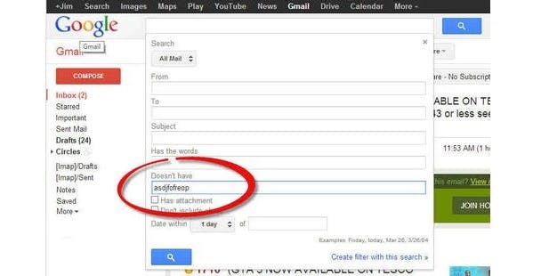 Allereerst, ga naar je Gmail-account in een webbrowser. Het is het eenvoudigst op een laptop of pc in plaats van je iPhone. Je moet al je berichten selecteren. Dit kun je doen door op het omlaag wijzende pijltje in het zoekvenster te klikken en in het Doesn't have-veld onzin te typen. Het MOET een woord of zin zijn die geen enkele e-mail zal bevatten.