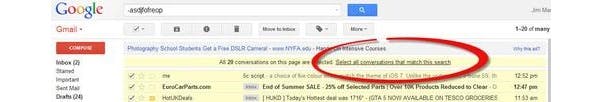 Klik op het vergrootglas-icoon om naar berichten te zoeken, en Gmail zal uiteraard elke e-mail vinden. Alleen de eerste 20 conversaties zijn geselecteerd, dus klik op de link om ze allemaal te selecteren.
