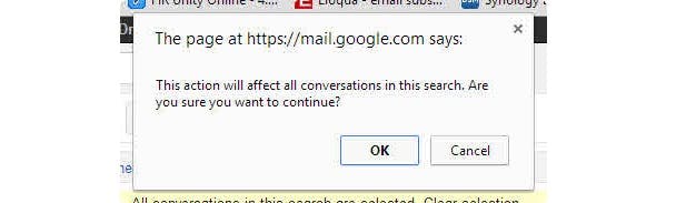 Gmail zal je waarschuwen dat deze actie invloed zal hebben op alle conversaties in de zoekresultaten. Dat is prima, dus klik op OK.