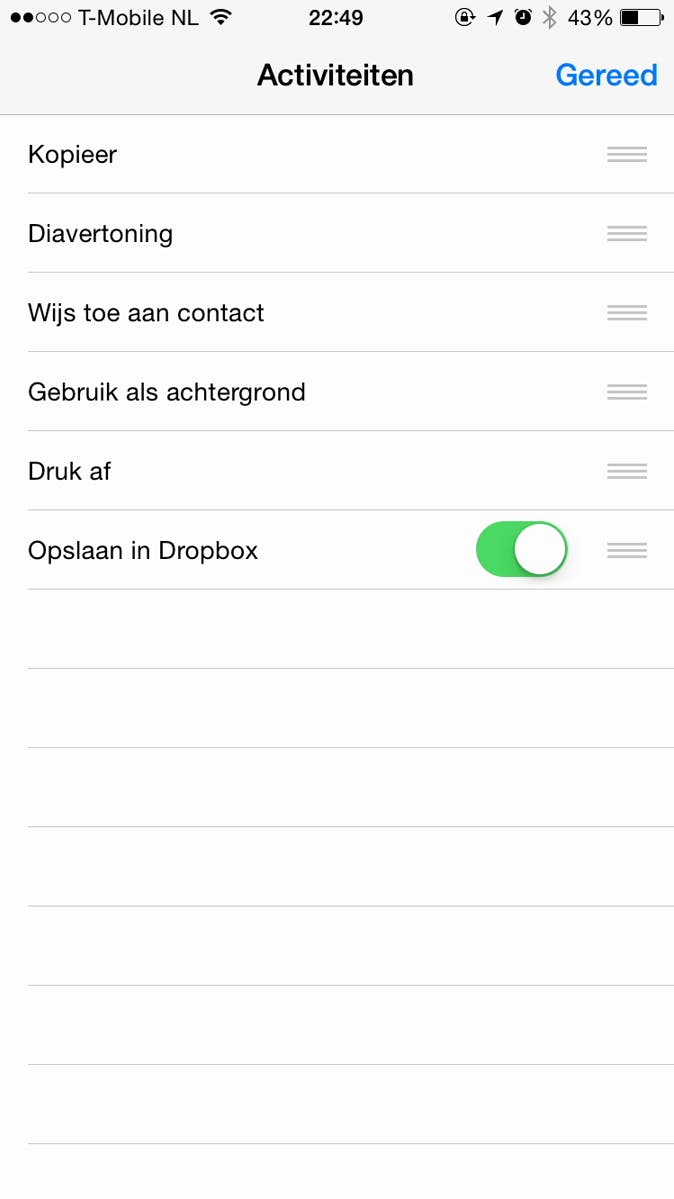 Zorg er eerst voor dat je de meest recente versie van Dropbox downloadt uit de App Store. Nadat je dit hebt gedaan, dien je de mogelijkheid om te delen in te schakelen. Dit kan op diverse plekken, de makkelijkste manier om dat nu even te doen is door naar de app Foto's te gaan, een foto te selecteren en te drukken op de knop Delen linksonder.