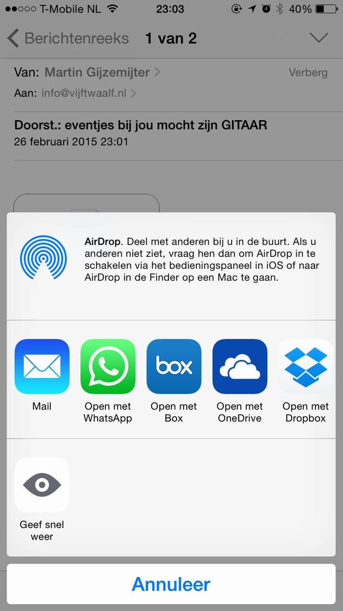 Maar hoe sla je nu daadwerkelijk bestanden op in Dropbox? De precieze manier verschilt uiteraard per app, maar ter illustratie zullen we een bestand opslaan vanuit de app Mail. Wanneer je een mailtje hebt ontvangen met een bestand daarin, dan druk je op deze bijlage om hem te downloaden. Wanneer deze gedownload is, en je drukt er vervolgens nogmaals op om hem te openen (even ingedrukt houden), dan vraagt Mail wat je met het bestand wilt doen.