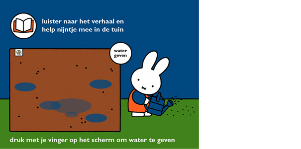 De tuin van nijntje is een interactief voorleesboek dat is gericht op zowel peuters als kleuters. De kleintjes naar de verhalen luister en kijken, terwijl kleuters mee kunnen doen met het verhaal. In het boek gaat nijntje in haar tuin harken, zaadjes zaaien en peentjes oogsten. Het spel bevat leuke spelletjes waardoor kinderen in het verhaal betrokken worden. Denk hierbij aan peentjes oogsten of een eigen tuin inrichten. Het boek bevat een handige functie waarmee je je eigen stem kan opnemen en dus het verhaal kan inspreken. Hierdoor kan je op elk moment voorlezen, zelfs als je niet aanwezig ben. Maximaal drie stemmen kunnen gelijktijdig worden opgeslagen. De tuin van nijntje is voor 2,99 euro in de App Store beschikbaar.