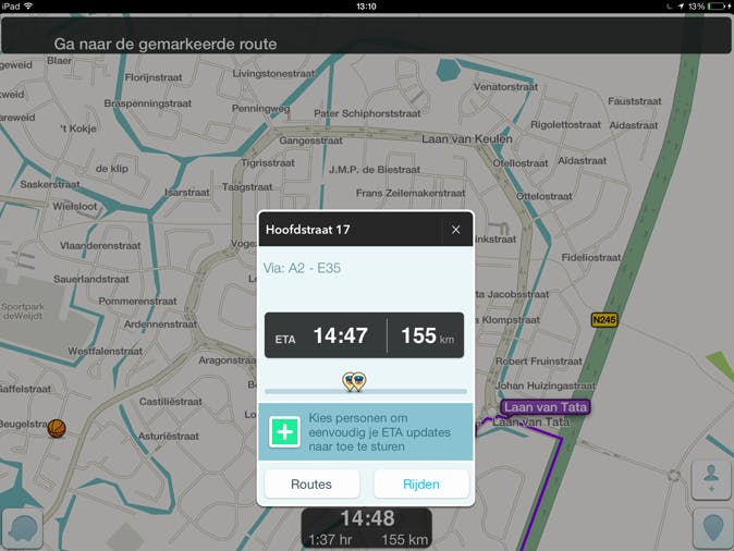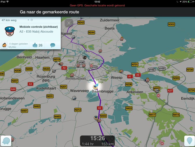 Via een verificatiecode heb je vervolgens toegang tot de app. Zodra je in het menu een bestemming hebt opgegeven, berekent Waze de snelste route. Handig is dat je eenvoudig een ander traject activeert wanneer je bijvoorbeeld een drukke snelweg wilt vermijden. De app geeft automobilisten Nederlandstalige instructies, waardoor je eenvoudig naar ieder adres navigeert. Overigens zijn er in de App Store nog meer navigatie-apps beschikbaar die je kunt uitproberen.