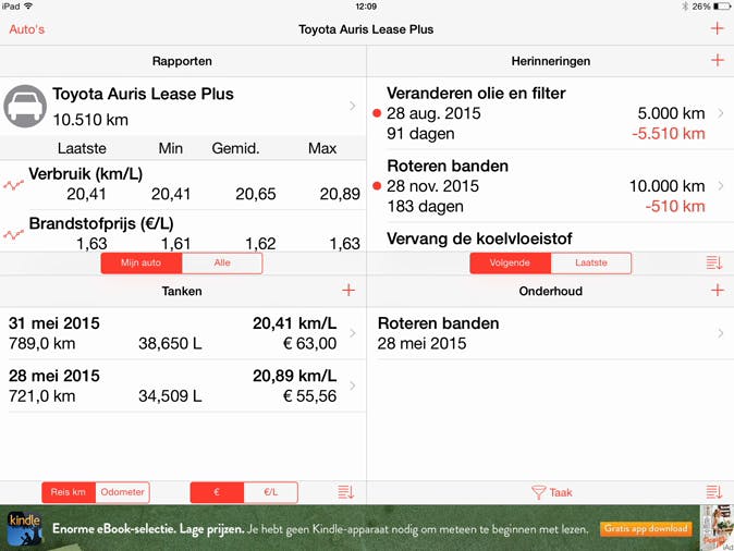 Vind je het lastig om bij te houden wanneer je auto aan onderhoud toe is? Je iPad helpt je hierbij! Installeer maar eens de app Auto Care Free. Na de installatie geef je de naam van de auto en de kilometerstand op. Je ontvangt vervolgens herinneringen zodra je bijvoorbeeld het oliepeil dient te controleren en de banden moet verwisselen. Je vergeet op die manier nooit meer om belangrijk onderhoud te doen. Na iedere tankbeurt dien je de kilometerstand bij te werken, waarna de app automatisch de onderhoudsdata aanpast.