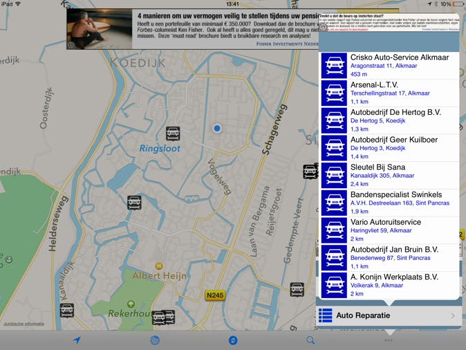 Wie onverhoopt ooit te maken krijgt met pech, wil natuurlijk graag hulp. De app Auto Reparatie laat op een plattegrond zien welke garages er in de buurt zijn. Door op een autopictogram te drukken vraag je adres- en contactgegevens op van het bedrijf. Je bekijkt de dichtstbijzijnde garages eventueel ook in een lijstweergave. Kun je er nog heen rijden? Dan start je direct een navigatieopdracht via Apple Kaarten.