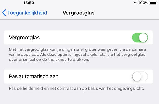 Om gebruik te maken van het vergrootglas druk je simpelweg drie keer achter elkaar op de Home-knop. Via de schuifregelaar in beeld stel je de vergrotingsfactor in. Extreem sterke vergrotingen leveren mogelijk wat onscherpte op, maar over het algemeen geldt dat het prima bruikbaar is. En o ja: niets staat je in de weg om dit vergrootglas ook als digitale verrekijker in te zetten. Onopvallend gluren is daarmee mogelijk, maar dat heb je ons niet horen zeggen natuurlijk. Om de vergrootglasmodus te verlaten druk je simpelweg één keer op de Home-knop.
