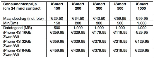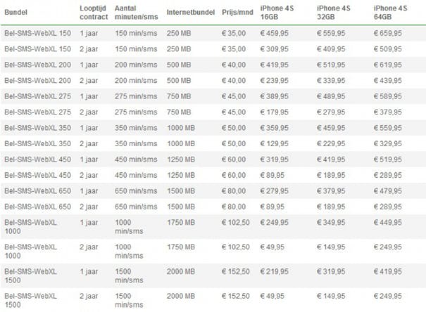 Daarnaast kun je natuurlijk de iPhone 4S bij een telecomprovider aanschaffen in combinatie met een abonnement. Zowel T-Mobile, Vodafone als KPN gaan de smartphone verkopen. T-Mobile heeft inmiddels de prijzen bekend gemaakt die zij voor het apparaat gaat hanteren. Aan de hand van de grootte van het abonnement dat je kiest kan het bedrag dat je moet bijbetalen behoorlijk verschillen. Hieronder vind je een overzicht van de prijzen van T-Mobile.