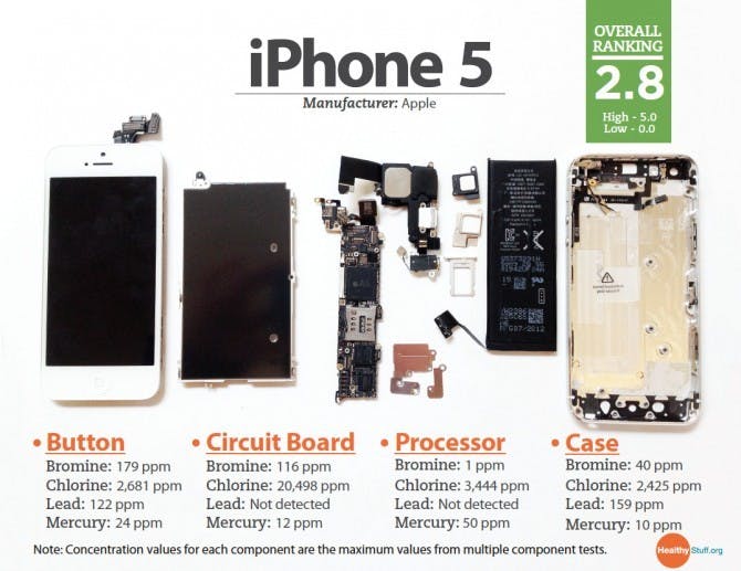 De iPhone 5 bevat relatief weinig schadelijke stoffen ten opzichte van andere smartphones. Dit stellen iFixit en HealthyStuff na een onderzoek waarin 36 smartphones werden gecontroleerd op de aanwezigheid van gevaarlijke stoffen.