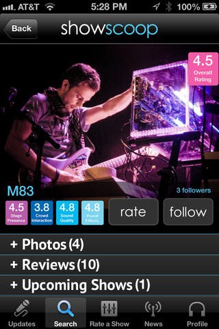 Een handige functie binnen ShowScoop is de mogelijkheid om artiesten of gebruikers te volgen. Hiermee heb je altijd snel toegang tot de artiesten of gebruikers die voor jou interessant zijn. Helaas zijn er van artiesten uit Nederland nog weinig beoordelingen in de app te vinden.