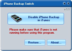 Met vastlopen doelen we dan op een back-upproces van een uur of 32 (letterlijk) en dat betekent dat uw telefoon al die tijd aan de pc moet blijven hangen. En de functie laat zich om eveneens onbekende redenen soms niet uitschakelen met de Escape-toets. In dat geval brengt iPhone Backup Switch uitkomst. U downloadt het programma via microseconds.com. Voordat u het start, dient u ervoor te zorgen dat iTunes is afgesloten. Vervolgens klikt u op de knop Disable iPhone Backup in iTunes. Dat is alles wat u hoeft te doen.