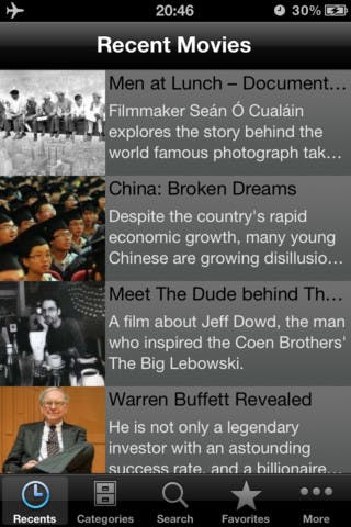 Documentary.net maakt de inhoud van Documentary Network ook op een prettige manier beschikbaar op de iPhone. Op het beginscherm van de app zijn de meest recent geplaatste documentaires te vinden. Wie op zoek is naar een specifieke categorie of onderwerp kan hier met de bijbehorende menu's naar navigeren. Opvallend is dat documentaires niet alleen binnen standaard categorieën zijn onderverdeeld, maar er ook op de lengte van video's kan worden gesorteerd. Deze toevoeging is erg handig voor personen die bijvoorbeeld net even tien minuten de tijd hebben om iets te bekijken.