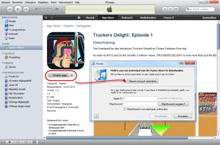 Zoek een willekeurige gratis app en klik onder het pictogram van de app op het knopje Gratis app. U krijgt nu wederom een klein aanmeldvenstertje te zien, klik op de knop Nieuwe account maken.
