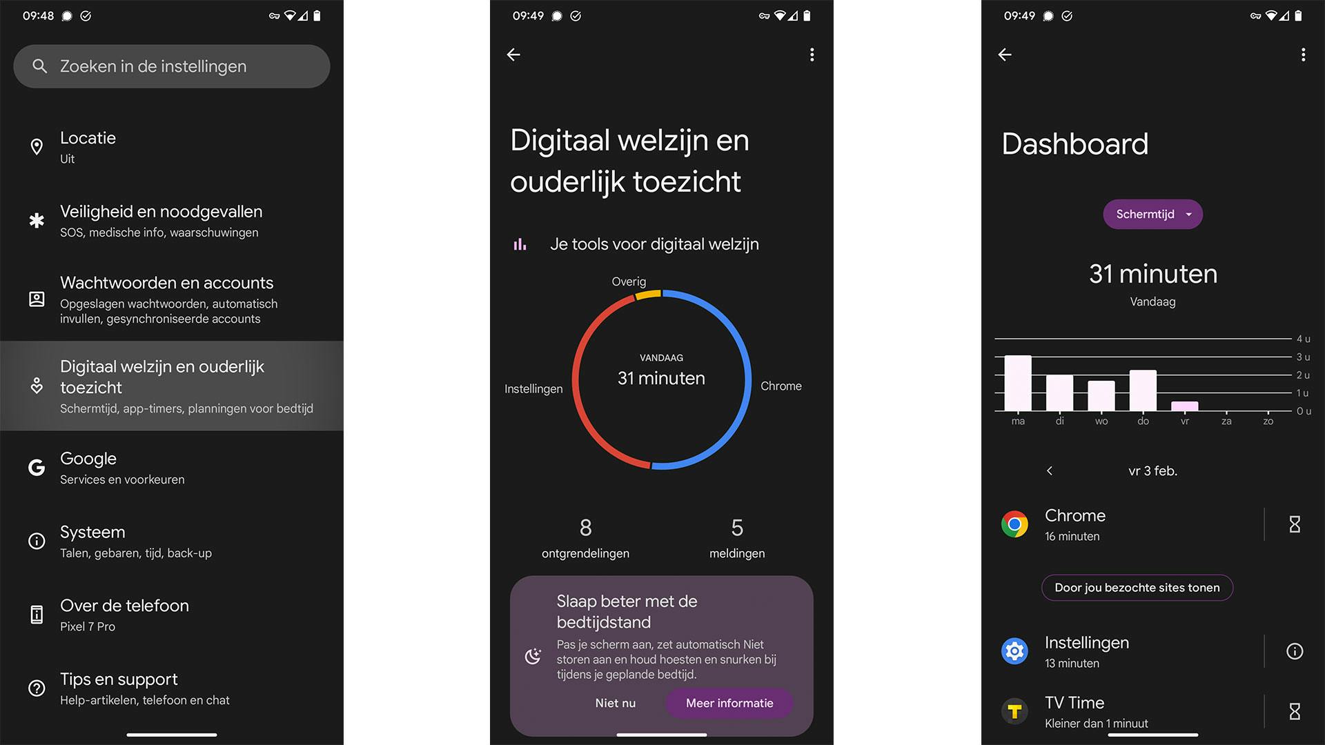 Om even tot je door te laten dringen hoeveel tijd je aan apps op je smartphone besteedt, kun je de opties voor schermtijd bekijken. Op Android ga je daarvoor naar Instellingen > Digitaal welzijn en ouderlijk toezicht. Daar krijg je dat meteen te zien. Je kunt ook nog op Dashboard tikken voor een uitgebreider overzicht. Daar kun je ook per app een timer instellen door op het zandlopertje te tikken. Op een iPhone ga je naar Instellingen > Schermtijd, en daarna naar Schakel schermtijd in. Dat is dan de maximale tijd dat je de smartphone op een dag kunt gebruiken.