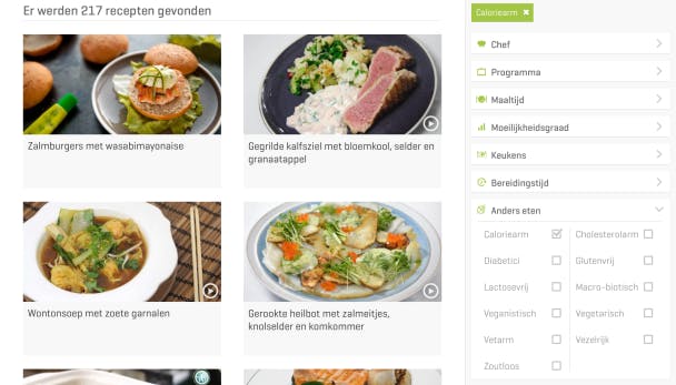 Zodra je caloriearm aanvinkt, krijg je een mooie selectie magere gerechtjes.