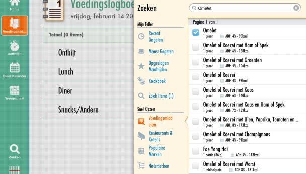 Wil je niet alles op een stukje papier pennen? Dan kun je de gratis app CalorieTeller door FatSecret eens proberen. Vink bij elke maaltijd aan wat je gegeten hebt en de app berekent het totaal aantal calorieën. Handig is dat er niet enkel een overzicht is van voedingsmiddelen en kant-en-klare bereidingen van populaire merken maar ook een lijst van populaire gerechten die je in een snackbar of in een restaurant kunt eten. Zo leert de app je bijvoorbeeld dat één cheeseburger goed is voor 275 calorieën en 13 gram vet.