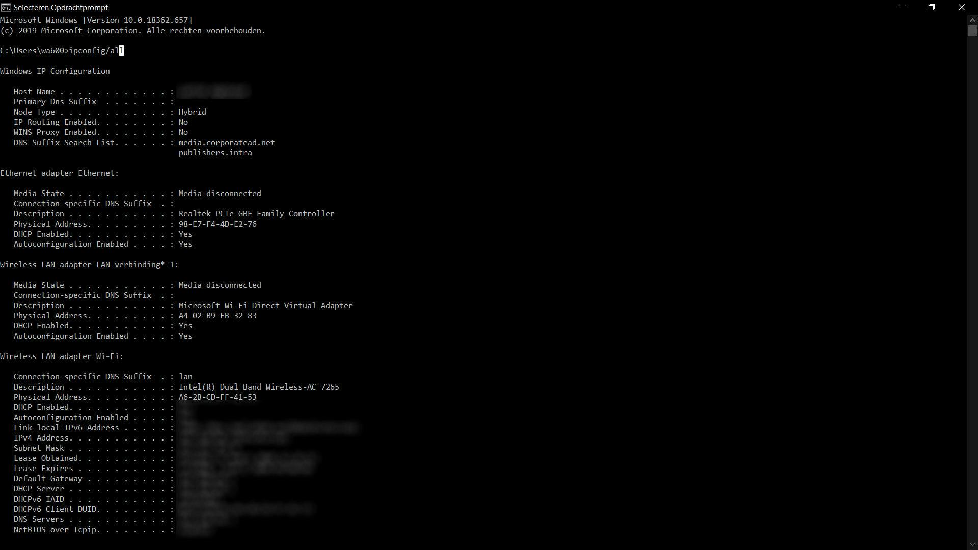 MAC-adres Windows 10 vinden via Opdrachtprompt