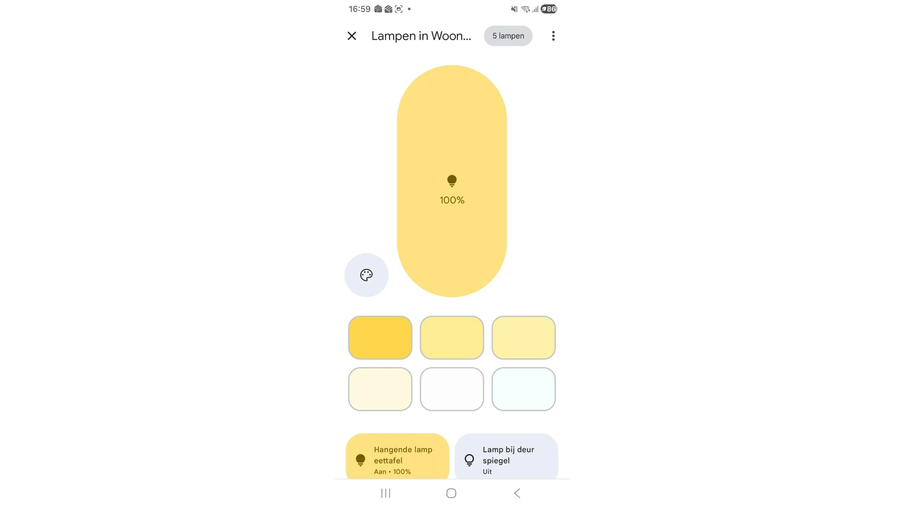 Heb je al je apparaten toegevoegd en eventueel onderverdeeld in verschillende ruimtes, dan kun je ze nu bedienen via je Google Home-app. Open de app, tik op de knop Alle apparaten bovenaan en je ziet alle tegels van de in Google Home aanwezige apparaten. Tik bijvoorbeeld op een lamptegel om die direct aan of uit te schakelen, of houd de tegel even vast om een schuifregelaar voor helderheid of kleur te zien.