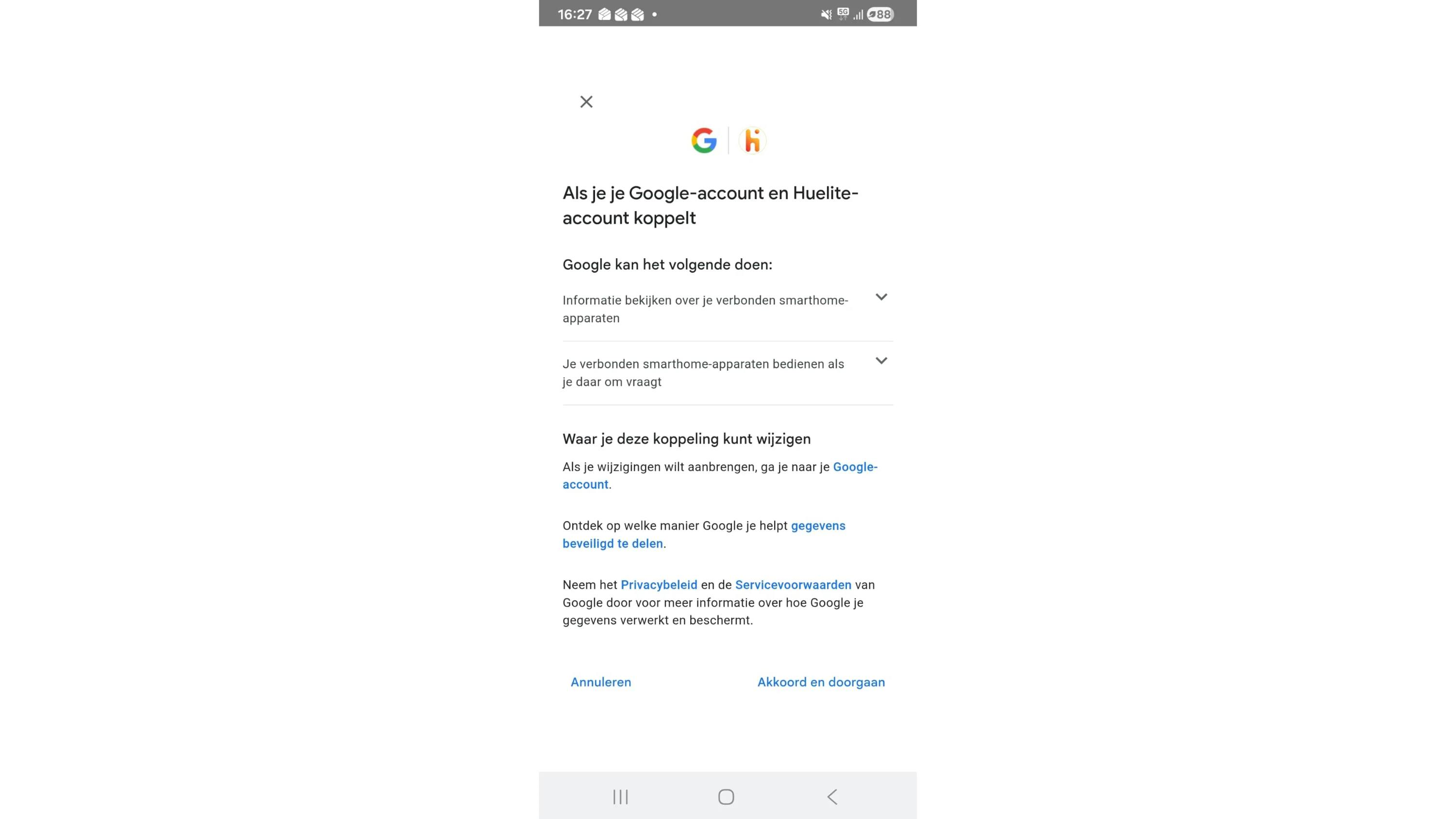 Om een apparaat via deze route toe te voegen aan Google Home, moet je inloggen bij het account van de fabrikant waarvan je de dienst afneemt, bijvoorbeeld Philips Hue. Er komen nog wat meldingen in beeld omtrent de mogelijkheden die Google krijgt met betrekking tot de data van je externe account.