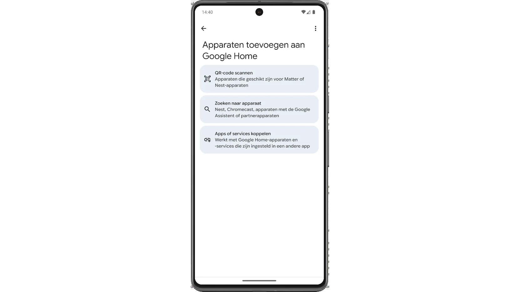 Je krijgt nu de mogelijkheid om een apparaat direct toe te voegen door middel van een QR-code, die je vaak achter op een product vindt. Apparaten die Matter of Nest ondersteunen, kun je op deze manier dus direct toevoegen. Wil je een apparaat toevoegen dat geen Matter-ondersteuning biedt, dan kan dat alleen als je het betreffende apparaat hebt geconfigureerd via het systeem van dat merk, bijvoorbeeld een lamp van Philips Hue die aan de Hue-bridge is gekoppeld. In dat geval kies je voor de optie Apps of services koppelen. Vervolgens krijg je een overzicht van alle compatibele diensten die met Google Home werken.