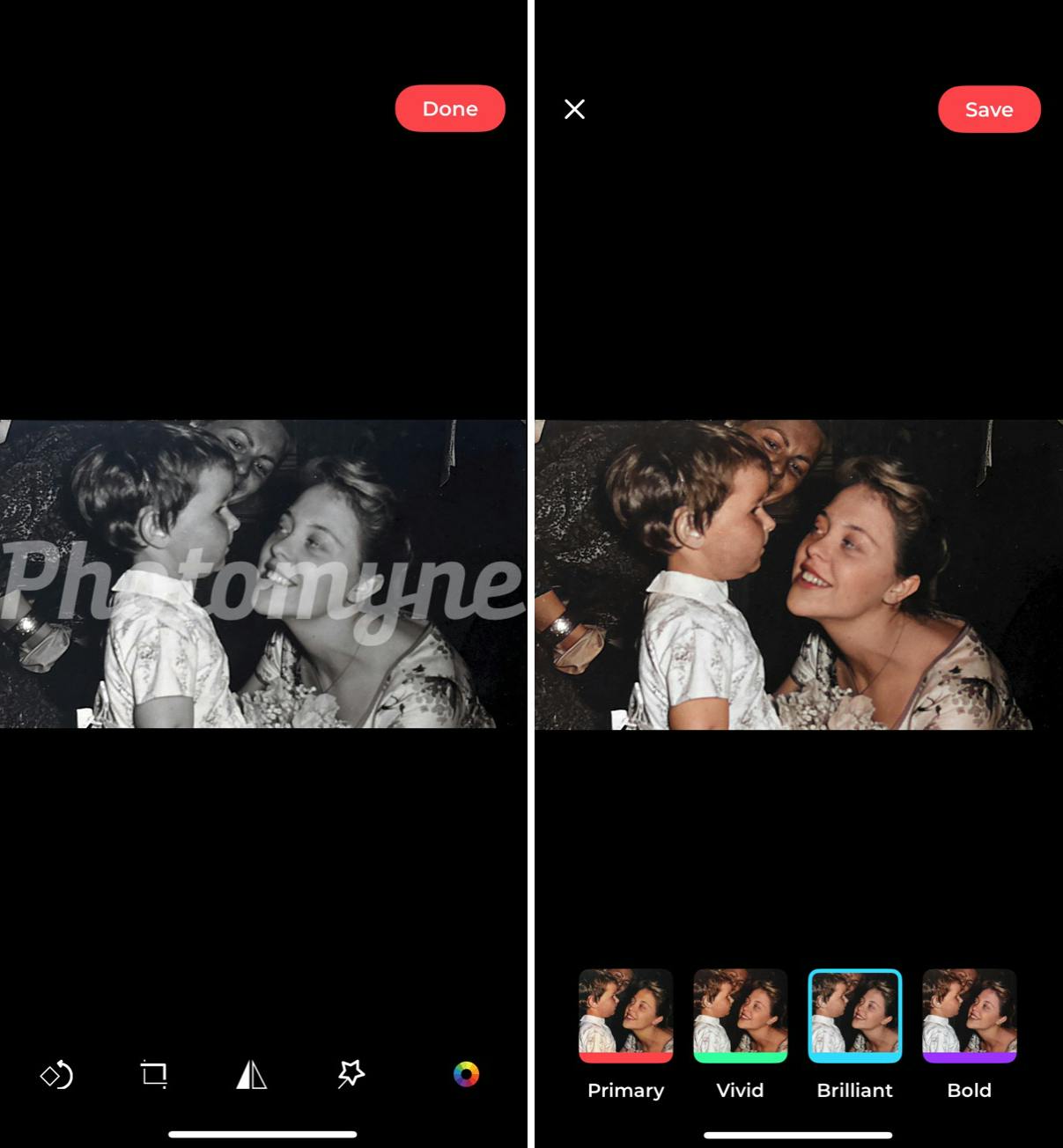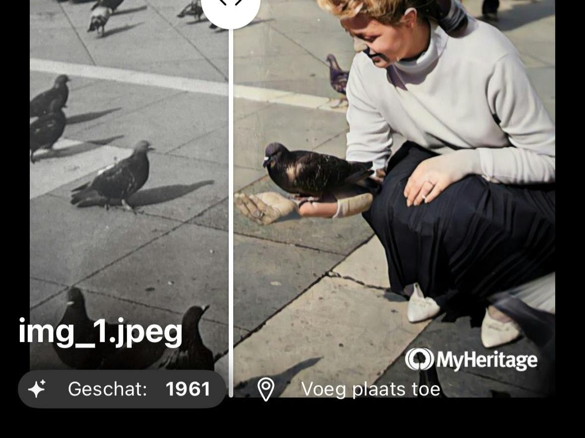 Omdat het telkens om één opname gaat en niet om een combinatie van verschillende shots, heb je soms wel wat last van schittering en reflectie. Kies je de optie Photos, dan vindt de Photo Scan App zelf de individuele foto’s. Bovendien optimaliseert hij de kleur- en helderheid, zodat het contrast en de verzadiging perfect zijn. Wanneer je de knop Edit gebruikt, kun je de oude zwart-witfoto’s door de software laten inkleuren. Dat doet Photomyne volledig zelfstandig. Er is geen mogelijkheid om te kiezen of een jurk blauw of roze zal zijn. De nadruk bij het inkleuren ligt vooral op de huidtinten.
