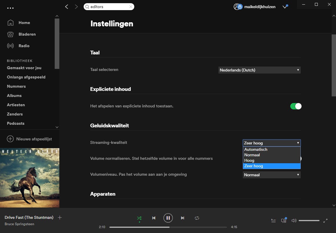 Bij gebruik van Spotify Premium profiteer je van een hogere geluidskwaliteit. Mogelijk staat deze functie nog niet ingeschakeld. Klik in het pc-programma bovenaan op het pijltje en ga naar Instellingen. Achter het onderdeel Streaming-kwaliteit selecteer je de optie Zeer hoog.