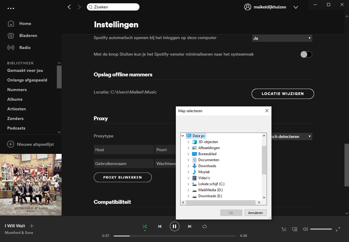 Klik bovenaan op het pijltje en ga naar Instellingen. Scrol een stukje omlaag en klik onderaan op Geavanceerde instellingen weergeven. Zodra je bij Opslag offline nummers klikt op Locatie wijzigen, stel je naar eigen wens een andere map in. Herstart Spotify om de wijziging door te voeren.