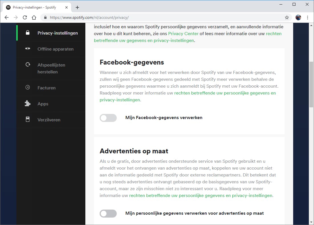 Bekende webdiensten hebben er een handje van om zoveel mogelijk gebruikersgegevens te verzamelen. Deze informatie gebruiken ze onder meer om gepersonaliseerde advertenties voor te schotelen. Spotify doet dat ook. Gelukkig steek je daar eenvoudig een stokje voor door de privacy-instellingen te wijzigen. Open de webpagina spotify.com/nl/account/privacy en log in met je accountgegevens.